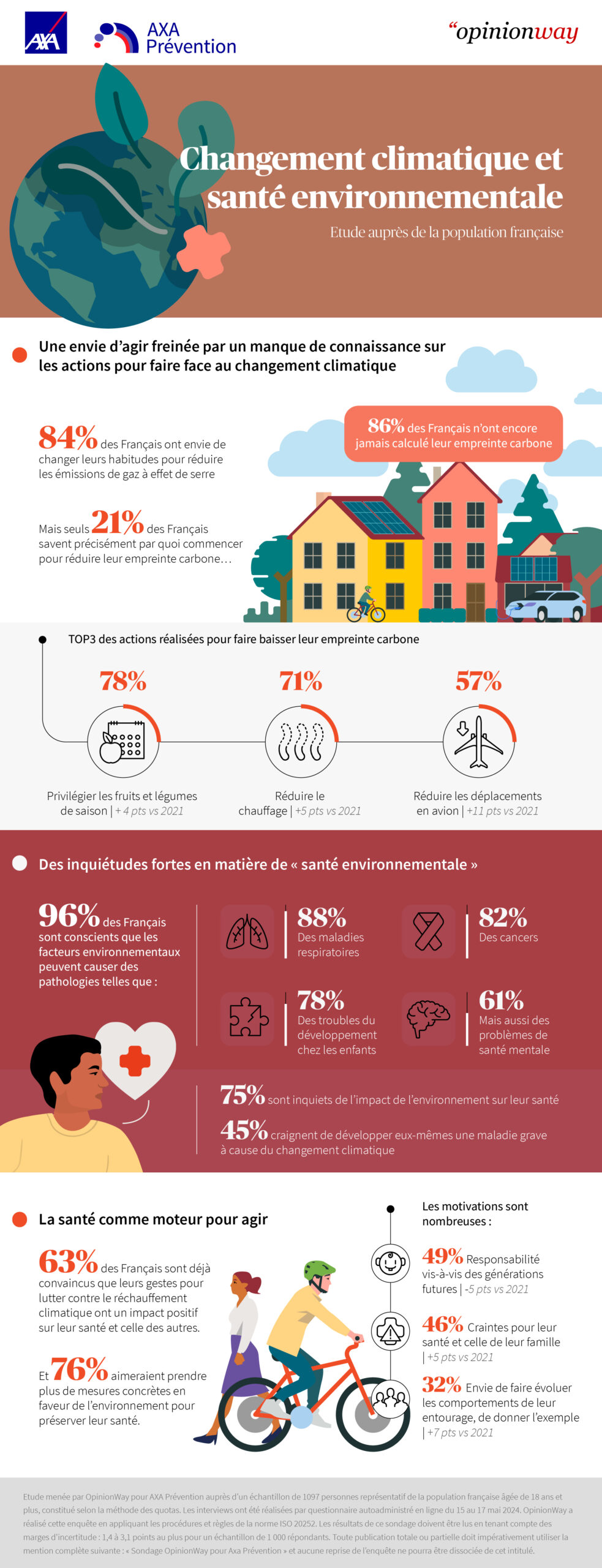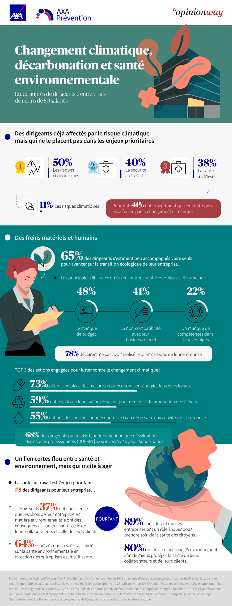 The two infographics present studies comparing French citizens and SME leaders on climate action. Both groups increasingly link environmental action to personal and public health.